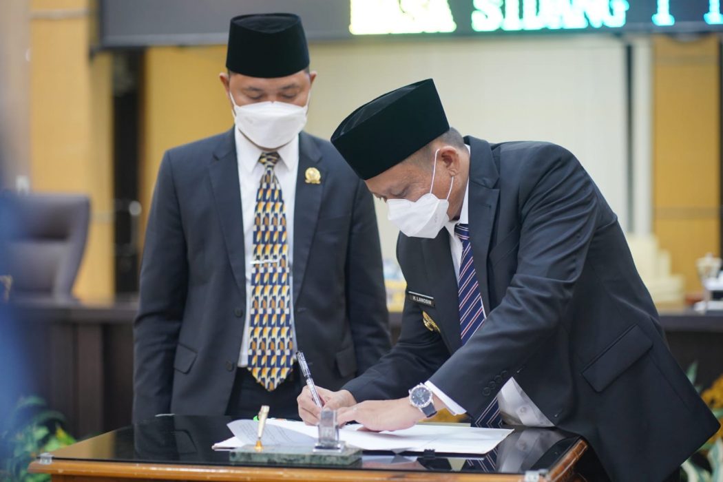 Perserujuan Raperda menjadi Perda ditandai dengan dilakukannya persetujuan bersama antara Bupati OKU Timur H. Lanosin Hamzah, ST atau yang biasa disapa Enos dengan unsur Pimpinan DPRD OKU Timur.