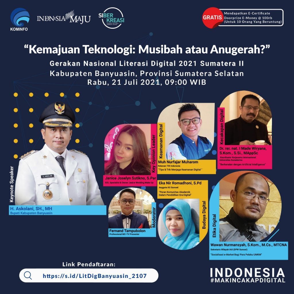 Sebagai Keynote Speaker, Bupati Kabupaten Banyuasin yaitu H. Askolani, SH., MH., memberikan sambutan tujuan Literasi Digital agar masyarakat cakap dalam menggunakan teknologi digital, bermanfaat dalam membangun daerahnya masing masing oleh putra putri daerah melalui digital platform. Bp. Presiden RI, Bapak Jokowi juga memberikan sambutan dalam mendukung Literasi Digital Kominfo 2021.