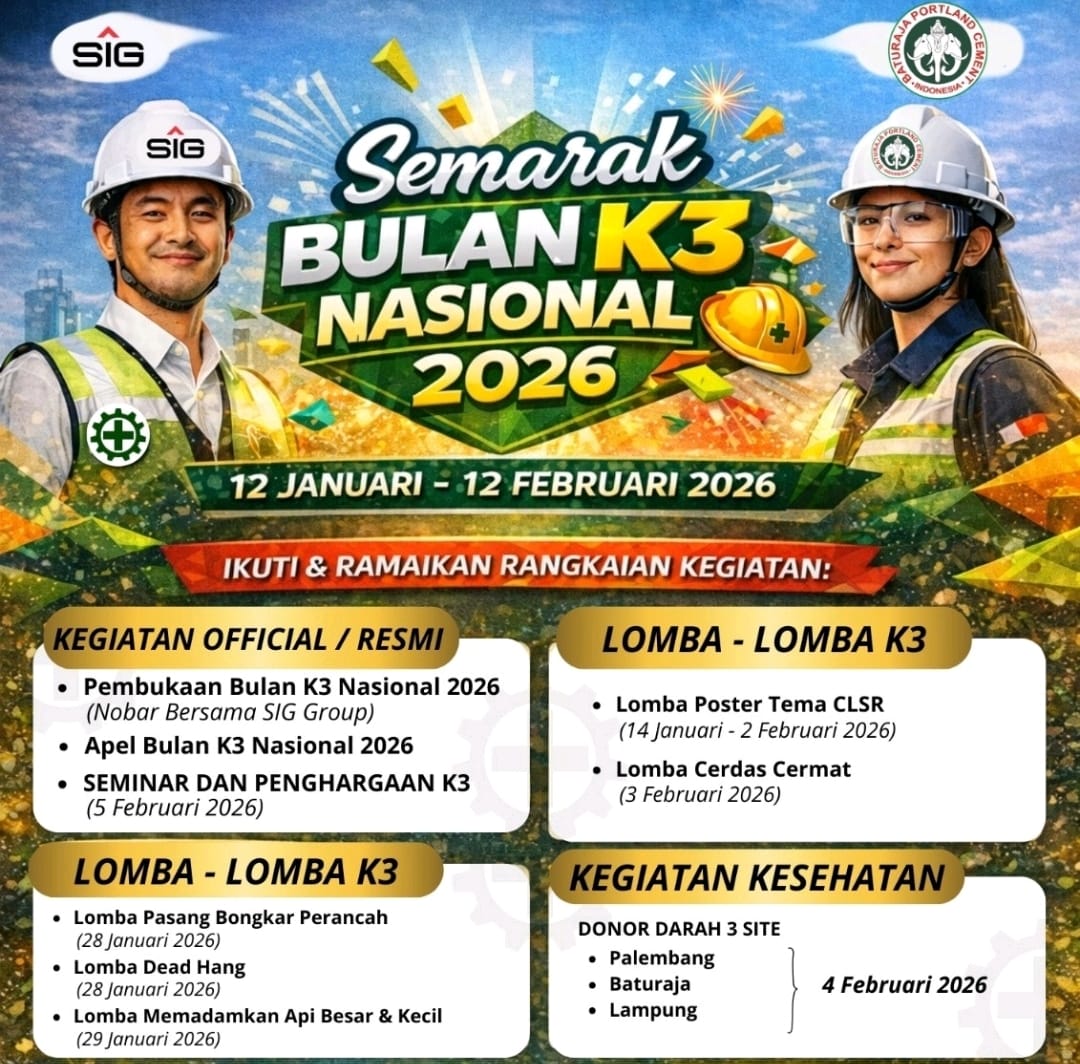 Rangkaian kegiatan tersebut meliputi Nonton Bareng Pembukaan Bulan K3 Nasional (SHE–SIG), Seminar Bulan K3 Nasional, Apel Bulan K3 Nasional, serta kegiatan sosial berupa donor darah yang melibatkan insan perusahaan, mitra kerja, dan kontraktor.